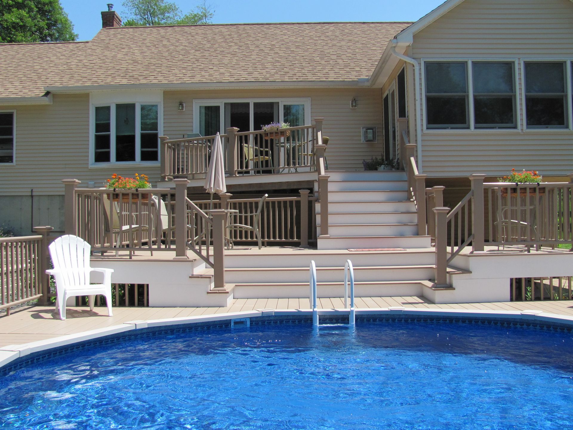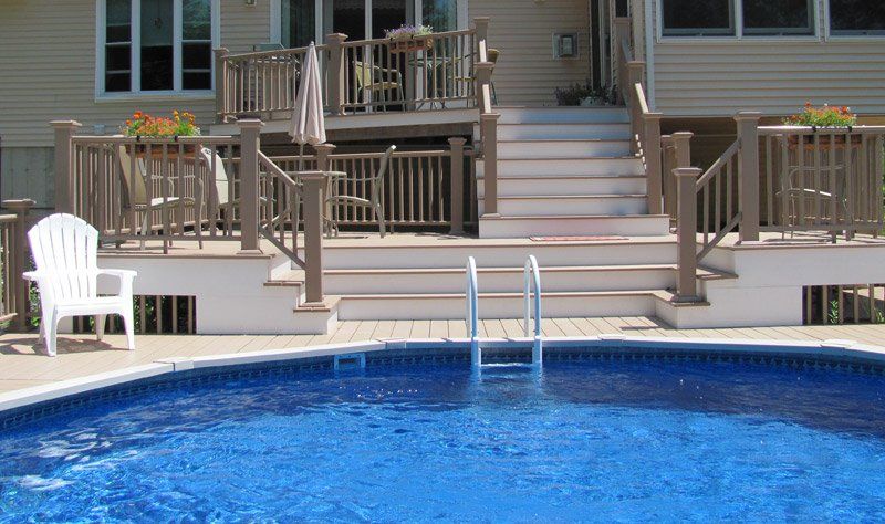 The addition of a custom deck or patio will compliment your pool and extend your home into the outdoors. Add color or decorative patterns to concrete around the pool, or ask us about the latest composite or natural wood deck building materials.
